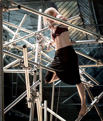 Schließlich bleibt Hölbling allein in ihrer metallenen Struktur, die aus verkabelten Röhren besteht, die durch eine ausgefeilte Klanginstallation von Hummer, zu jammern und zu weinen scheint , als wäre sie mit der Inbesitznahme durch den menschlichen Körper gar nicht glücklich. Doch wie sich der biegsame Körper mit der sperrigen Materie befreundet, so nimmt auch diese den Eroberer an. Fast schnurrt sie am Ende. Die Tänzerin weiß auch zu verführen, hat das schwarze Gewand abgeworfen, pendelt kopfüber in reizender Spitzenunterwäsche.