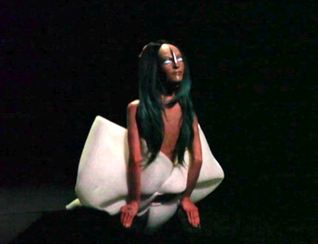 Von der finsteren Bühne stechen leuchtend grüne Augen auf die Reihen. Könnte eine Katze sein, eine Hexe oder ein Cyborg, ein Wesen, das Mensch und Maschine zugleich ist. Der Untertitel der Show – „a cyborg utopia“ legt die Überlegung nahe. Unheimlich sind diese Augen auch dann noch, wenn sich das Wesen in riesenhafte Höhen erhebt und sich dem Publikum mit verkehrt montierten Armen nähert. Es dämmert mir: Auf hohen Kothurnen schreitet ein Mensch rückwärts, das Gesicht ist eine am Hinterkopf montierte Maske. Dieses Kunstwerk allein genügt, ich könnte eine ganze Vorstellung lang dieser Figur mit dem Januskopf zusehen, wie sie sich bewegt, die Arme hebt und schlenkert und sich im Licht biegt und wendet. Doch Malika Fankha – dass sie es ist, war von Beginn an klar, es steht nur eine einzige Darstellerin auf dem Programmzettel – hat noch mehr in ihre Büchse, die nicht von Pandora geliehen ist und nur Grauslichkeiten enthält,