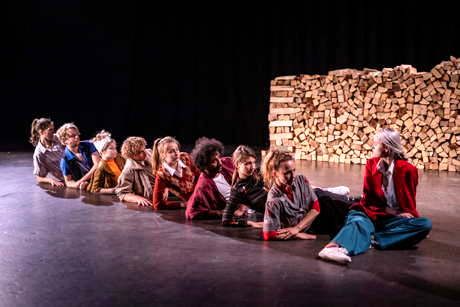 Stillstand und Eile, Schweigen und Reden, Sehnsucht und Wut, Zärtlichkeit und Aggressivität, eben „MeinAllesaufderWelt“. Dementsprechend wird vor allem synchron und im Takt gerollt und gerutscht, gestolpert und gestrampft, gerannt und stillgestanden, gesprochen und geschwiegen. Und die Scheite sind immer dabei, als hoch aufgeschichtete Grenze, an die manche stoßen (vorsichtig natürlich, damit die mühsam errichtete Wand nicht in sich zusammenfällt), als Einzelstück in fließender Bewegung weitergegeben, am Anfang wird der Holzstoß kleiner, am Ende der rollenden Staffel größer, oder als Liebhaber:in ans Herz gedrückt, wie ein Wickelkind getragen und in aufwallendem Zorn von sich geworfen.
