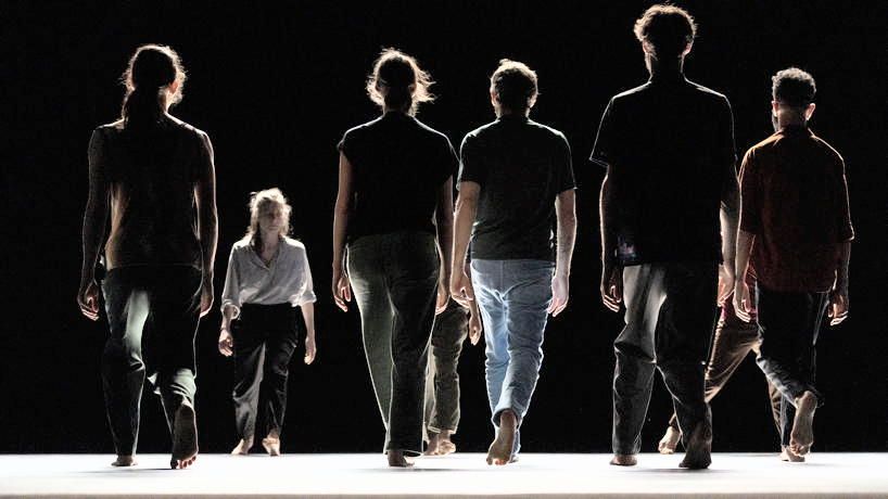 Die Einsame, blickt hin unf wieder nach oben, wo sich die Segmente von zehn Lichtbalken in rätselhaftem Rhythmus von hinten auch vorn schieben, aufblinken, verlöschen, oft ist die Bühne hell, doch die Tänzer:innen sind im Dunkel. Noch ist die Frau allein, manchmal durch das sie erfassende Licht glühend, als würde sie von einem Strahlenkranz eingehüllt, dann wieder von der Dunkelheit fast verschluckt. Das Solo beinhaltet im Bewegungsablauf und den Emotionen schon das gesamte Stück, das in der Folge von einer Gruppe aus zehn Tänzer:innen gezeigt wird.