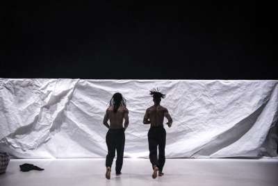 Um den Körper, den afrikanischen, farbigen, schwarzen Körper geht aus auch bei dieser Performance ohne Ausweg, Mufutau, der nach dem Vorspiel einige Zeit als Nacktskulptur – nicht aus weißem Marmor wie der Florentiner David, sondern mit dunkel glänzender Haut und dem Publikum den Rücken zuwendend – im dunklen Hintergrund steht, versucht – da muss ich jetzt die Programmauskunft zitieren, „die Politik rund um den Schwarzen Körper in der zeitgenössischen westlichen Gesellschaft zu verstehen; er untersucht Konzepte von Repräsentation, falscher Repräsentation und fehlender Repräsentation.“ Keine Erleuchtung! Was zu sehen ist, sind zwei Schwarze Körper, die sich bewegen, tanzen, gehen, trippeln, stampfen, die anfangs hinterlassenen Spuren habe sie längst verwischt, sie sind nicht mehr sichtbar. Es dauert eine Weile, bis sich die Choreografie entwickelt. Yusuf und sein Partner, Lukah Katangila – aufgewachsen in Goma / Kongo-Kinshasa, ist er seit 2013 professionellere Tänzer und Choreograf – lassen sich Zeit, gehen eine gefühlte Viertelstunde auf und ab, mit kleinen und mit großen Schritten, gemeinsam oder getrennt, Yusuf macht hie und da eine verzierende Bewegung mit einem Bein. Das Bühnenbild ist weiß, doch die das Licht bleibt gedimmt, die beiden tanzen mit dem Rücken zum Visionarium, das durch die Geräuschmaschine von Mick Donohoe und die Takte einer Komposition von Tom Lane auch zum Auditorium wird. Die Geräusche / der Lärm – Krachen, Kratzen, Knistern, Reißen, Grollen, Rollen, Donnern und Poltern – erzählen von Verfall und Kampf, von Zerstörung und Wut, mitunter erklingen hohe Schreie.