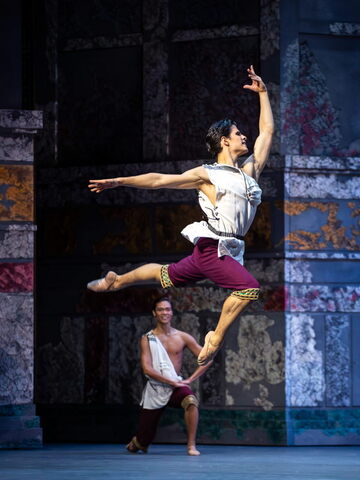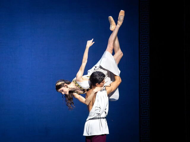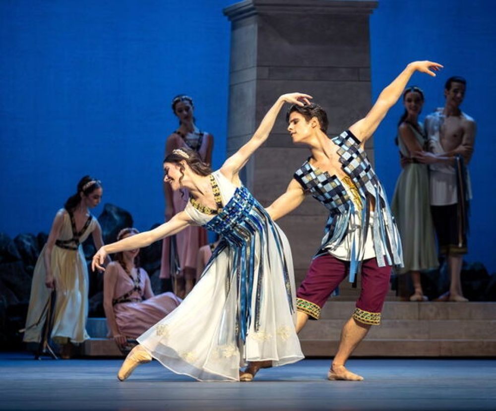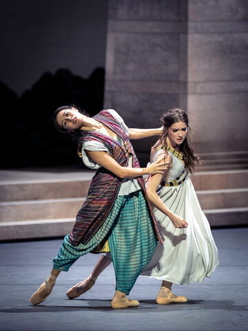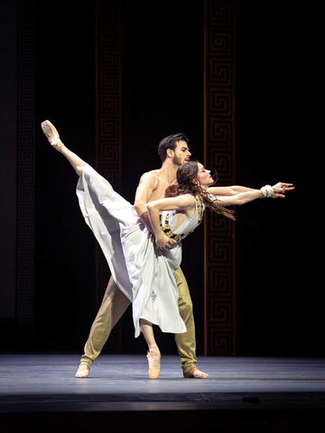 und António Casalinho haben sich bereits im September in der Aufführungsserie von Giselle vorgestellt. Als Liebespaar Kallirhoe / Chaireas tanzen sie zum ersten Mal gemeinsam. Trenary, ist in der Titelrolle keine unnahbare Schönheit, einer gefühllosen Göttin gleich. Ihre Kallirhoe ist eine gefühlvolle, temperamentvolle junge Frau, die vom Cup de foudre getroffen wird und für Glück tanzt. Was macht es da, wenn manche Hebung ein wenig verwackelt ist und der Körper sich nicht zu einem Bogen spannt, wie es Madison Young gelingt. Später, wenn das Liebesglück von Neidern zerstört worden ist, tanzt sie auch Angst und Verzweiflung. Aus dem bunten Treiben auf der mit griechischen Säulen und verfallenen Gebäuden unter dem blauen Himmel ist plötzlich eine berührende Geschichte geworden. Ihr Partner, der blutjunge Portugiese António Casalinho, hat seine Karriere 2021 im Bayerischen Staatsballett begonnen und ist nach drei Jahren zum ersten Solotänzer ernannt worden.