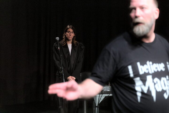 Zum Glück ist ein Techniker im Raum, repariert die Sicherungen und versucht das Publikum auf die Notausgänge aufmerksam zu machen. Endlich beginnt der Film.Die Verwirrung und das Mitleid mit der ungeschickten Ansagerin löst sich in Wohlgefallen auf. Die Vorführung– eine Irreführung. Der Vorhang bleibt geschlossen, das Licht wird nicht gelöscht, der Film entsteht auf der Bühne und in den Köpfen der Zuschauerinnen.