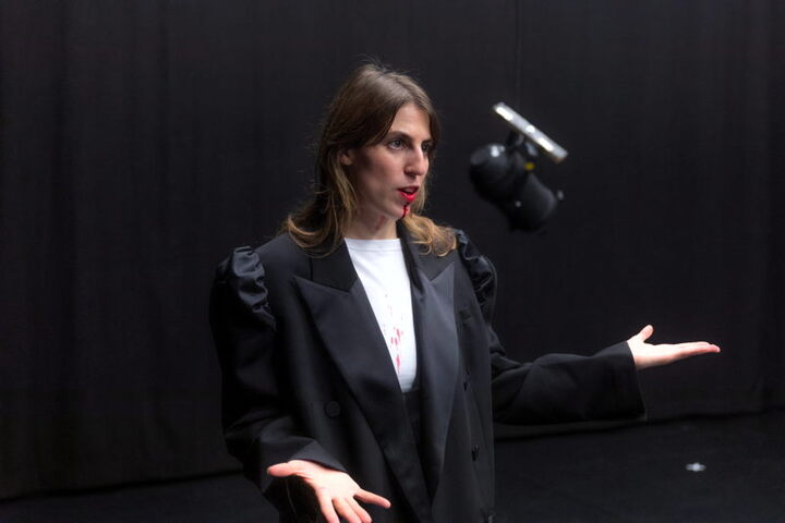 Doch Cappelli ist nicht nur viele Figuren, sondern auch das Thema und die Entstehung, sie ist die Dekoration und das Mobiliar, die Kamera und führt die Regie. Sie ist sogar die berühmte Darstellerin der Tierrollen und zeigt, wie diese, die auch mit weltbekannten Darstellern und Regisseuren auf der Leinwand zusehen war, das Pferd war, das eines Nachts ihre Großeltern besucht hat. Da wird die Fiktion zur Realität, um dann mit einem Knall zu kippen und zum Horrorfilm zu werden. Ein Messer blitzt auf, Schatten geistern über die Wände, der Bürosessel bewegt sich von selbst, Blut tropft von der Decke und dem weiblichen Vampir aus dem Mund.