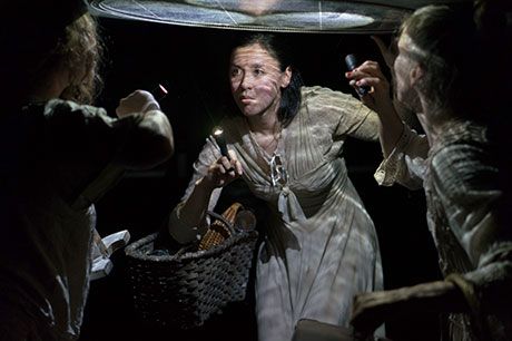 Der Theatersaal im Dschungel ist in eine Wohnung verwandelt. Auf der Bühne hat Andre Szakál mit Spitzenvorhängen ein zauberhaftes Schlafzimmer eingerichtet. In den Kostümen von Veronika Susanna Harb bewegen sich drei Performerinnen huschend und trippelnd mit sonderbaren Armbewegungen. Sie erinnern mich an die „zauberhaften Hexen“, Prue, Piper und Phoebe, aus der US-Fernsehserie „Charmed“ und etwas Ähnliches sind sie wohl auch. Sie erscheinen hinter den Fenstern, zaubern mit kleinen Lampen tanzende Schatten und benützen einen Spiegel und allerlei bunte Glasfläschchen, um ihre unverständliches Ritual auszuführen. Vielleicht habe ich aber auch diese Szene nicht so richtig verstanden, weil vor meinen (und vieler anderer) Augen ein Koffer mit aufgeklapptem Deckel stand, der was dahinter geschah total verborgen hat.