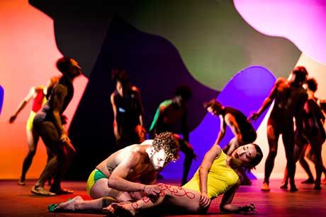 Hübsch der Beginn mit „L’Après midi d’un faune“ von Claude Debussy. Waclaw Nijinksy hat die Choreografie der sinfonischen Dichtung 1912 in Paris uraufgeführt. Anders als beim „Sacre“, als die Musik Strawinskys das Publikum kreischen ließ, war es beim „Faune“ Nijinskys angeblich sehr deutliche erotische Interpretation des in der heißen Nachmittagssonne von den Nymphen fantasierenden Fauns. Die Schwüle die Debussys Musik (nach einem Gedicht von Stéphane Mallarmé) evozieren soll, hat auch Sasha Waltz zu ihrer lässigen Choreografie eingefangen. In einem bunten Popart-Geviert entsteht Strandbadatmosphäre. Die Tänzer_innen in ebenso bunten Trikots, spazieren über den Rasen, liegen blinzelnd in der Sonne, dehnen, recken, strecken, sich, flirten und liebäugeln miteinander, wohin das führt, bei so viel nackter Haut, weiß man ja – keine Skrupel: Auch die Erotik ist dan diesem Nachmittag gedämpft, so wie so spielt sich alles, der Hitze entsprechend, in Slow Motion ab. Am Ende machen die Badegäste schlapp, klappen einfach zusammen. Das kleine Stückerl hat Waltz 2013 in der Berliner Staatsoper (zur Zeit im Schillertheater) uraufgeführt.