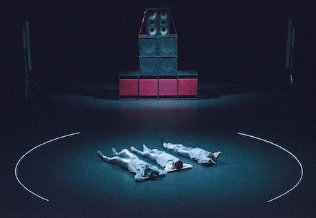 Auf der kreisförmigen Bühne liegen drei silbrige Körper, vielleicht Raumfahrer oder Besuch aus einer anderen Galaxie. Das Publikum bildet einen lockeren Halbkreis, sitzt rechts und links der Bühne auf Augenhöhe mit den Tänzer*innen und auf den Stufen der von den Sesseln befreiten Zuschauertribüne. Im Hintergrund droht mächtig der Lautsprecherturm, Leuchtstoffröhren bilden den Außenkreis der Bühne. Dieses Setting und die zu Beginn kaum merklichen Bewegungen der drei Körper entwickeln einen Sog, der es leicht macht geduldig zu warten, bis die in ernsthafter Stille zaghaft gehobenen Beine immer höher steigen und das Trio endlich zu einer synchronen Bewegung findet. Mit angewinkelten Unterschenkeln liegen sie da, glitzernde Knieschützer lassen die Oberschenkel als Stümpfe aufragen, wieder muss ich an Wesen der fremden Art denken. Für die passenden Kostüme sind Lise Lendais und Ines Kirchengast verantwortlich; die Bühne ist von Jenny Schleif und Ines Kirchengast gestaltet.