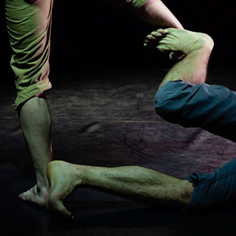 Gefühle kann der Körper besser und authentischer vermitteln als alles Geschwätz; Gedanken allerdings, theoretische Überlegungen sind schwer in Mimik und Gestik umzusetzen. Ist auch egal: es sind zwei ausgezeichnete Tänzer zu sehen, die miteinander kaum kommunizieren, sich lediglich mit den Fußsohlen berühren und um ihre Balance ringen, allein (im Plié auf einem Bein) oder gemeinsam, einander umkreisend, umschlingend, mit den Beinen, mit dem Torso, synchron den Raum durchmessen, die Hände suchend ins Nichts streckend. Zwei Tänzer, die ihren Körper beherrschen und in voller Harmonie und Spannung sich miteinander bewegen, einander treffen und wieder trennen, konzentriert auf den Augenblick, die genannte „oneness“, achten, um sich gleich wieder in die vom Körper diktierten flüssigen Bewegungen einzulassen. Und am Ende die Anfangsposition einnehmen, ausgestreckt liegend, nur die Fußsohlen nehmen Kontakt auf. Für einen Augenblick ist die Balance vollkommen.