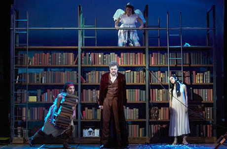 Leerlauf gibt es keinen auf der Zauberinsel, landen doch die Söhne (Riccardo Angelo Strano, Countertenor, Johannes Bamberger, Tenor) des bösen Bruders und verursachen samt einem drunken sailor, eindeutig die lustige Figur in dem Verwirrspiel, bestens bei Stimme einigen Aufruhr, for allem in dieweiblichen Herzen. Pistolen knallen, Mädchen kreischen und der Caliban verkuppelt seine zauberhafte Schwester, die, bei Licht besehen, nur eine barbusige Fetzenpuppe ist, mit dem Matrosen. Am Ende aber ist die Bibliothek leergefegt, das blaue Meer, nicht mehr windbewegt, wird sichtbar, jeder Topf bekommt seinen Deckel, die Töchter befreien sich aus des Vaters Tyrannei, um sich in die ihrer Ehemänner zu begeben, Ariel darf frei durch die Lüfte streifen und Caliban kann die Küchenschürze ablegen, er ist nun der einzige Gespons, den der geläuterte, auf der Insel zurückbleibende Prospero noch hat. Mit großen, traurigen Kulleraugen schmiegt sich der Geist,