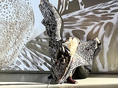 Woran können wir uns noch festhalten, wenn alles Schwindel ist, die Bilder verzerrt, gefälscht, wie Wasser den Augen entgleitend? Tarnen und Täuschen scheint das Motto dieser Aufführung zu sein, in der sich die Tänzerinnen, Anna Maria Nowak, Breanna O‘Mara, Hannah Timbrell, und Tänzer, Luke Baio, Dong Uk Kim, Dante Murillo, gemeinsam mit den Live-Videos bewegen und verwandeln. Figuren aus einer anderen Welt, Tiere, Gespenster, Himmel und Berge tauchen auf, die Außenhaut wird ständig gewechselt, ein wildes Tier, Reptilien, süße Katzen, elegante Vögel, eine Christus-Figur oder ist es die marmorne „verschleierte Jungfrau“? Nicht nur die Haut wird im unaufhörlich auf das Publikum brausenden Sturm der Bilder immer wieder von neuem übergezogen. Die dehnbaren Kostüme hat Teammitglied Stefan Röhrle entworfen und sich dabei selbst übertroffen. Die Farben schimmern, die Pailletten glitzern, die Tänzerinnen präsentieren sich als Diven, um gleich wieder zu verschwinden, sich auf der Silberfolie zu aalen und mit sich selbst in Dialog zu treten. Eisberge wachsen, die Kunstgeschichte grüßt von der Videowand, die Gestaltwandler und -wandlerinnen tummeln sich mit leeren Augen in der Ewigkeit, müssen lachen und auch seufzen, haben kein Geschlecht und auch keine Zukunft. Sie spielen Komödie und merken nicht,