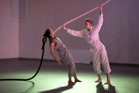 Georg Blaschke verbindet in seinen Choreografien gerne bildende Kunst mit dem bewegten Körper. Weil der Aufführungsort diesmal unter der Erde liegt – die hohen Fenster in der noch ziemlich rohen Betonhöhle ließen, gingen Menschen vorbei an der Adresse Am- Ostrom-Park 11, nur die Beine sehen –, hat er in seine Recherchearbeit auch Höhlenzeichnungen einbezigen. Die Stammesgeschichte des Menschen ist unvorstellbar lang und beginnt quasi mit der Abspaltung einer noch auf allen vieren gehenden Spezies vom Schimpansen. Daran erinnern auch die Tänzerinnen Alina Bertha, Julia Müllner und Maartje Pasman gemeinsam mit dem Tänzer Andras Meszerics. Er bewegt sich zu Beginn als Urzeit-Jäger, trägt eine Wurfwaffe an einem um den Oberkörper geklemmten Gestellt, jagt auch hinter den Frauen her, die ihrerseits mit Stoffbahnen und Seilen beschäftigt sind. Wie Tiere gehen sie auf allen vieren, versuchen auch auf den Händen zu gehen und die Wand hoch zu klettern, schwingen auf dem Seil und rutschen in der zu einer Hängematte geformten langen Stoffbahn über den harten Betonboden. Die Gruppe ist in dauernder Bewegung, T