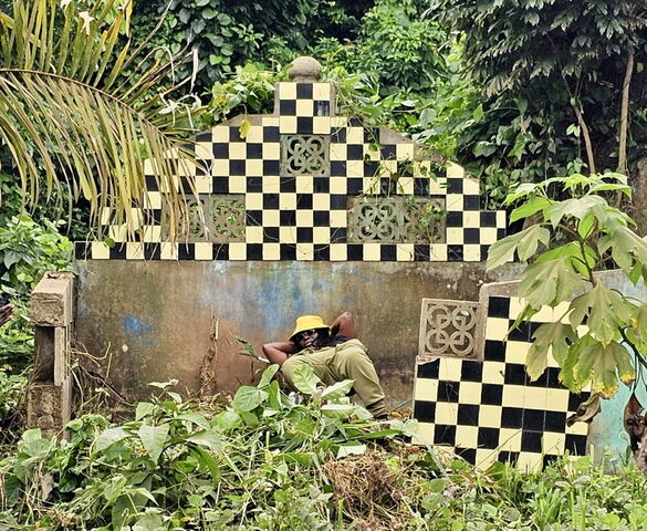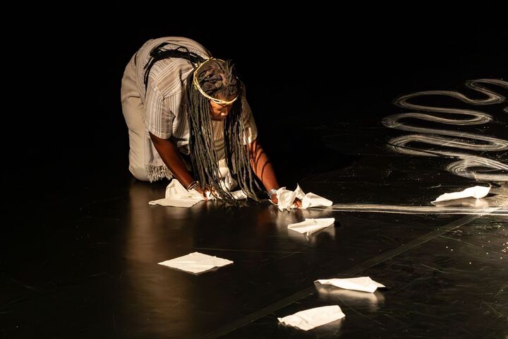 Aus diesen wenigen im reduzierten Bühnenbild von Jean-Christophe Lanquetin angedeuteten Relikten lässt Beugré eine Welt der Erinnerungen erstehen, in denen die Geister der Toten spür- und hörbar werden. Ein angedeuteter Baum, dessen tote Ästen die beiden Performerinnen in Ketten, Gürtel und Kopfschmuck verwandeln. Taschentücher aus Schweiß und Tränen, von denen Beugré zuerst einige an das Publikum verteilt, um die verbleibenden auf dem Bühnenboden auszustreuen. Aus einem kleinen Haufen Kaolin entstehen gewundene Wege, ein Dorf, ein Ortskern, in dem man die einst hier lebenden Menschen wiederzusehen glaubt. Lange schon nicht mehr hier lebende Verwandte, Freunde, Bewohner:innen, für die kurz darauf aus denselben Taschentüchern eine Art Begräbnisstätte auf dem Boden errichtet und mit einem zu Beginn von Beugré zusammengerollten und unter dem Baum gelegten weißen Baumwolltuch bedeckt wird.