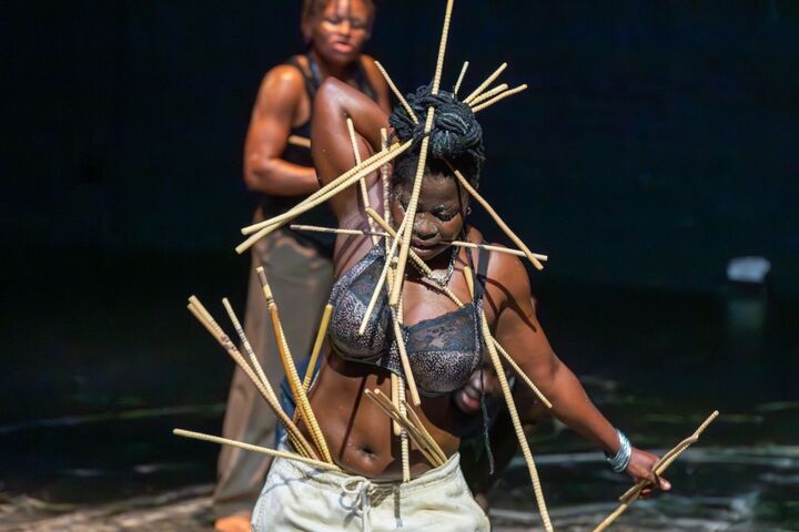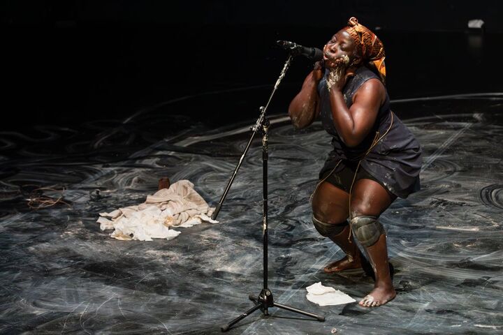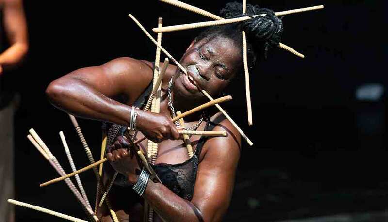 Nadia Beugrés Reise beginnt nicht mit der Protagonistin selbst, sondern ihrer wunderbaren Begleiterin, der Sängerin und Schlagwerkerin Charlotte Dali. Gesänge, Percussion-Einlagen, in denen die Körper der beiden Performerinnen zu wundersamen, schmerzhaften Instrumenten werden, langsame, tranceartige Schreitbewegungen, dann wieder wild durch den Raum wuchernde Tänze bilden den dramaturgischen Kern der Suche nach den Spuren einer Kindheit und den Erinnerungen daran, von den nichts mehr als Wege, Bäume und staubbedeckte Gräber noch zu finden sind.