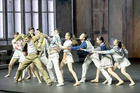 Jakob Feyferlik ist der neue Lehrer im Ballett „Petruschka“ von Eno Peçi. Ein geschmeidiger Lehrer, dem das Unterrichten bei den wilden Buben und kecken Mädchen wenig Freude bereitet. Immer knickt er ein, als richtige Gliederpuppe, wie es der originale Wurschtl Petruschka ja auch ist. Diese weichen Bewegungen liegen dem Solotänzer mehr als die eckigen des Lehrers, der versucht sich durchzusetzen. Umso härter der Kontrast zur selbstverliebten, eitlen Direktorin, von Rebecca Horner als verführerische Schlange getanzt, die weder Respekt noch Liebe aufbringt. Ein Höhepunkt des Balletts in der Schulklasse (das Hintergrundszenario von Pavol Juráš erinnert, wie manche Zitate, an den Originalschauplatz wo die Puppen lebendig werden) ist der Pas de trois des Lehrers mit der Direktorin und der Ehefrau (Nina Tonoli). Von der Ballettakademie kommt fröhlich springend Raphael Grotrian als gemeinsamer Sohn.