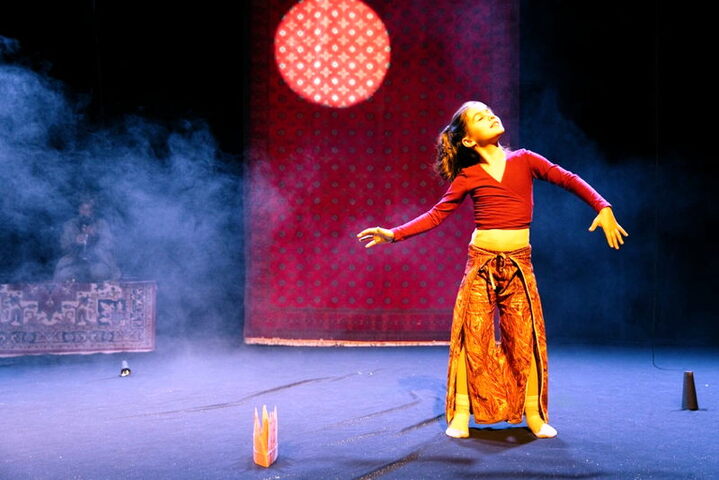 Der Wind bringt ihr wunderbare Träume, entführt sie in ein Zauberreich, in dem sie unbekannte, magische Wesen trifft. Einen tanzenden Zentauren, der die Hufe wirft wie in der spanischen Reitschule, zwei Reisende, die miteinander tanzen und einen rituellen Messertanz aufführen. die kleine Layla staunt und versucht die magischen Tanzbewegungen mitzumachen. Das Publikum begnügt sich mit dem Staunen, vergisst das Theater, vielleicht sogar die mitgekommenen Eltern, träumt vom orientalischen Zauberreich, in dem eine Prinzessin mit silbernem Kopfschmuck auftaucht.