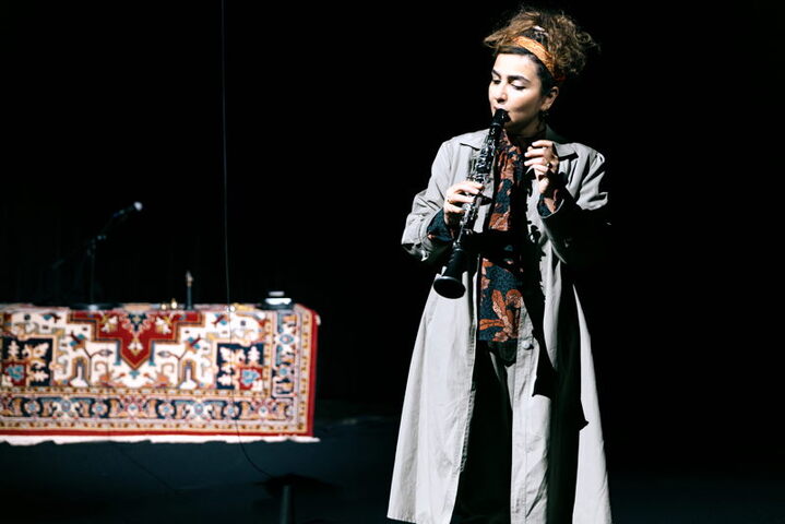 Im Hintergrund hängt ein roter Teppich, wunderschön. An der Seite hinten steht ein Tischchen mit einer Lampe und allerlei Krimskrams, darauf sitzt entspannt Mona Matbou Riahi mit ihrer Klarinette. Sie ist Layla, eine erwachsene Frau, die Klarinette begleitet den Tanz, ist zugleich der Wind: Malaika. Mit einem erschreckenden Knall fällt ein altes Buch vom Himmel, der Wind ha es her geweht. Es ist Laylas altes Tagebuch und schon ist auch die kleine Layla, dargestellt von der Ahyoka Krappmann, einem Volksschulkind. Ein Naturtalent, die sich auf der Bühne wohlfühlt, tanzt und turnt, erzählt und singt, fröhlich und ohne Lampenfieber.