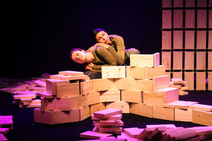 Der Anfang ist das Ende, das Ende des Waldes. Auf der erhöhten Bühne ist eine Baustelle aus frisch geschnittenen Holzklötzen aufgebaut. Emsig wird damit gearbeitet, Türme und Häuser werden errichtet und wieder demoliert; Holz fällt mir Krach von der Bühne, ein Chaos entsteht und die ordnung wird wieder hergestellt. Ich wähne mich im falschen Stück, doch die jungen Zuschauerinnen sehen dem Baukötzespiel gespannt zu.